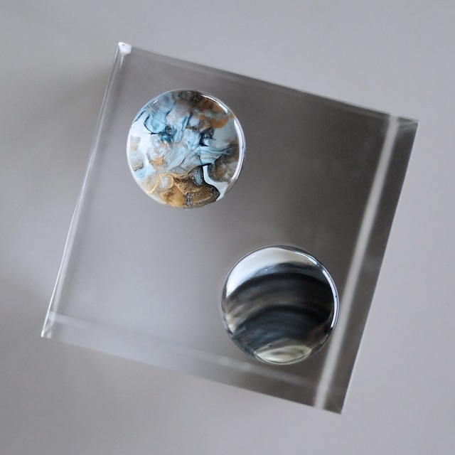 風景を描くように、小さなレジンの中に光のかけらや空気感を閉じ込めるように色を重ねていく。ひとつひとつ手作業だからこそ、同じ色でもわずかに表情が違ってきます。その違いこそが、Éclatのレリーズボタンの魅力だと思っています。